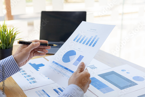 Businessman holding financial documents, he owns a startup company, he sits checking the company's financial summary prepared by the finance department. Management concept of startup company.