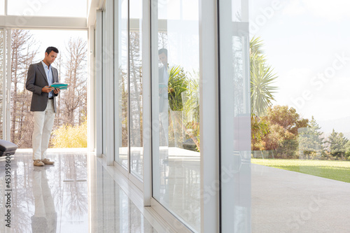 Businessman holding folders at office window
