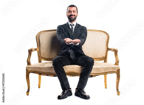 necktie, attaching, lifestyle, business, work, men at work, manager, boss, businessman, professional, executive, isolated, man, hispanic, male, person, adult, attractive, caucasian, photogenic, latin, beard, armchair, vintage, antique, chair, sofa, furniture, style, couch, old, retro, elegance, comfortable, to sit, relax, advertisement, concept, empty, gesture, hand, hold, palm, presenting, product, showing, something, space, up