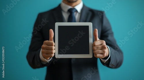 businessman, holding, tablet, showing, thumb up, gesture, suit, attaching, approval, agreements, success, ok, like, hand, electronic device, screen, blank, communication, digital, technology, modern, professional, confident, elegant, male, corporate, business, person, adult, torso, indoor, studio, shot, presentation, display, advertising, message, positive, copy space