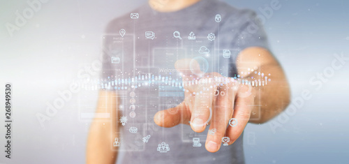 Businessman holding User interface screens with icon, stats and data 3d rendering