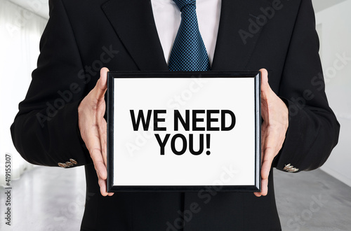 Businessman holds a signboard with the message we need you. Human resources recruitment or employment