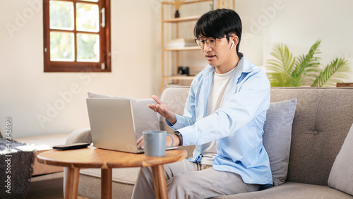 Businessman in casual is sitting comfortable sofa and wearing headphones to explaining business information