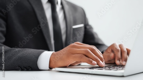Businessman in formal suit typing on laptop, isolated clean white office
