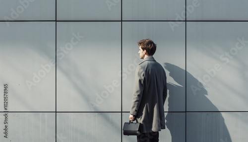 businessman, briefcase, modern building, urban, professional, lifestyle, business attire, corporate, city, office, executive, confident, standing, minimalistic, modern architecture, city life, contemporary, wall, business meeting, waiting, high contrast, shadow, daytime, success, career, business district, urban setting