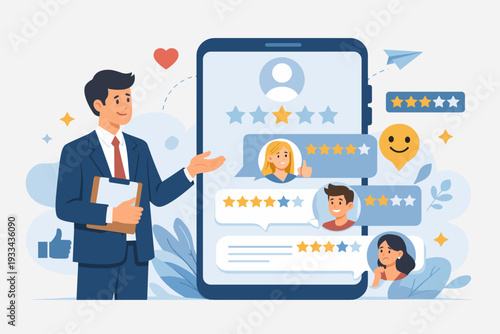 client, feedback, rating, review, business, online, smartphone, mobile, businessman, star, testimonial, service, satisfaction, life events, marketing, reputation, quality, user, interface, app, communication, opinion, survey, evaluation, client, support, digital, technology, illustration, vector, flat, design, social, media, icon, thumb, nubes, message, bubble, profile, person, people, management, strategy, growth, success, trust, recommendation, commerce