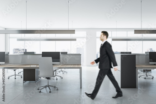 Businessman in suit walking in bright coworking meeting room interior with daylight, furniture and equipment. Design and ceo worker concept.