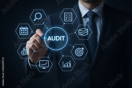 Businessman interacting with digital audit flowchart and icons on dark background finance