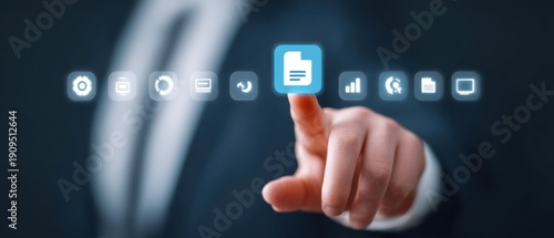 Businessman Interacting with Digital Document Icon on Touchscreen Display in Modern Office Environment
