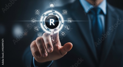businessman, digital, interface, touch, virtual, buttons, copyright, symbol, technology, futuristic, interaction, suit, professional, man, hand, finger, click, select, activate, permission, access, control, security, protection, intellectual property, right, management, regulation, compliance, innovation, advancement, solution, service, system, network, cyber, data protection, privacy, information technology, software, hardware, engineering, design