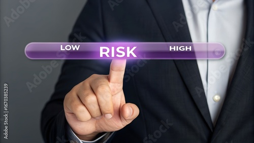 risk, assessment, management, business, strategy, decision, finance, investment, analysis, control, evaluation, planning, security, danger, safety, uncertainty, probability, level, slider, interface, digital, technology, futuristic, screen, touch screen, interaction, pointing, finger, suit, businessman, corporate, concept, datum, progress, bar, gauge, indicator, monitoring, performance, optimization, challenge, opportunity, forecast, prediction