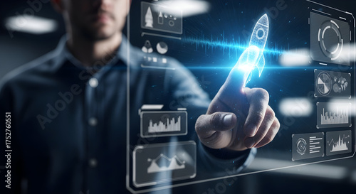 startup, business, technology, innovation, digital, modern, futuristic, launch, progress, success, achievement, future, growth, development, idea, strategy, planning, touch screen, interface, rocket, datum, chart, graph, network, creative, vision, concept, cyberspace