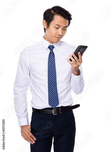 man, guy, male, boy, business, businessman, executive, formal, expertise, professional, entrepreneur, banker, manager, corporate, leader, mobile, phone, mobile phone, phone, smartphone, message, text, screen, read, look, isolated, white, background, people, person, portrait, 1, young, youth, blue, photogenic, gentleman, smile, happy, japanese, korean, chinese, asia, asian, china, mandarin, taiwanese