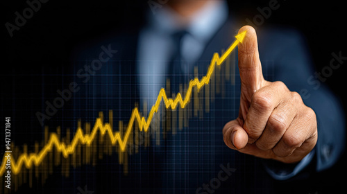 Businessman pointing at a rising graph, symbolizing growth and success.