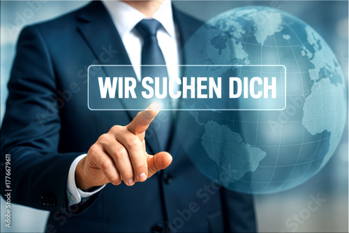Businessman pointing at virtual interface with german text “Wir suchen dich” – global recruitment. Digital job search, international talent, modern recruiting