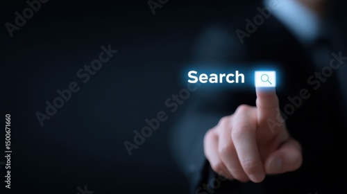 search, searching, virtual, interface, digital, browsing, network, find, finding, browse, connect, connection, innovation, future, futuristic, cyberspace, website, web, magnifying glass, icon, touching, pressing, dark, background, strategy, analysis, research, cognition, exploration, discovery, query