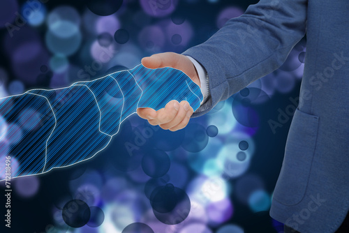 agreements, ai, artificial, background, blue, business, businessman, businessperson, client, closeup, communication, company, concept, connection, cooperation, corporate, cyber, dark, deal, digital, discussing, distant, electronic, future, futuristic, hand, hand, handshake, help, illustration, intelligence, cyberspace, learning, machine, network, partner, partnership, process, professional, science, shaking, success, support, team, tech, technology, together, trust, view