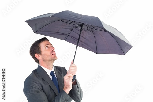 Businessman sheltering under black umbrella
