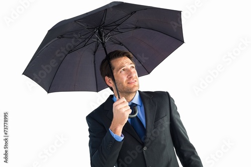 man, male, caucasian, cut-out, isolated, businessman, suit, well-dressed, attaching, shirt, blue, jacket, business, career, professional, profession, corporate, smart, elegant, posh, stylish, sophisticated, brown hair, short hair, photogenic, attractive, umbrella, black, shelter, protection