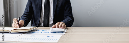 Businessman sits in a private office at his company and is reviewing company financial documents, senior management checking financial information for accuracy. Financial management. copy space