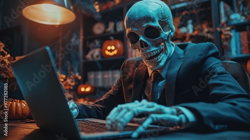 Businessman Skeleton in Suit Typing on Laptop Amid Spooky Office Halloween Decor