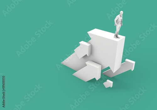 Businessman standing on a white arrow. Business growth and develpment concept. 3D Rendering