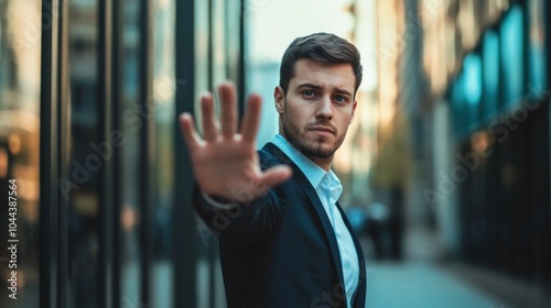 man, person, business, suit, hand, stop, gesture, formal, professional, city, street, urban, building, pose, portrait, male, model, serious, confident, style, fashion, office, businessman, corporate, modern, adult, standing, executive, entrepreneur, casual attire, daytime, daylight, background, window, colours, sharpened, depth, of, field, photo