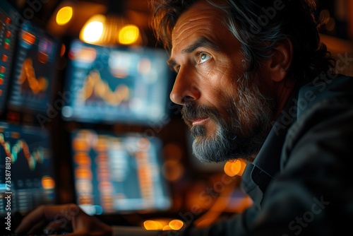 Businessman Studying Stock Market Trends Across Multiple Screens in Dimly Lit Office