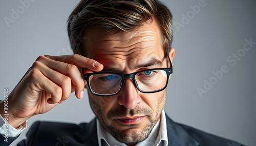 businessman, goggles, taking off, massaging, isolated, stress, work, overworked, office, tension, relief, exhaustion, productivity, professional, health, wellness, relaxation, workaholic