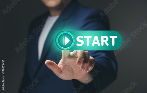 Businessman touch on virtual screen start button for business concept of new start, business planning, strategies and challenges or career paths, opportunities, and changes.