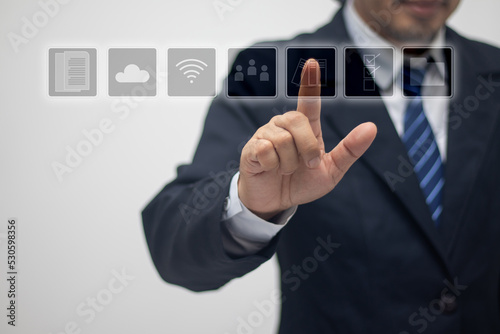 Businessman touches the screen with a finger to select an icon.