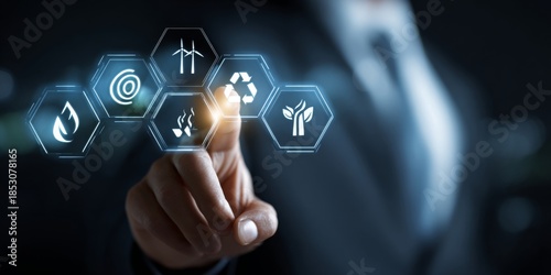 Businessman Touching Digital Icons Representing Climate Change, Sustainability Efforts, Renewable Energy, Carbon Footprint, and Eco-Friendly Initiatives