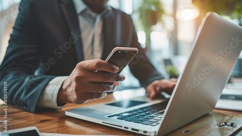 Businessman using a smartphone and laptop simultaneously at a desk