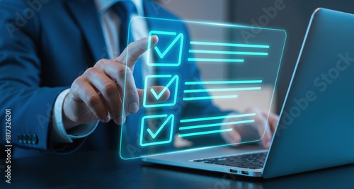 businessman, checklist, compliance, quality control, virtual, technology, laptop, business, checkmark, productivity, efficiency, standard, regulation, digital, management, hologram, interface, futuristic, inspecting, survey, complete, icon, goal, success, solution, corporate, system, policy, online, innovation, concept, background, modern