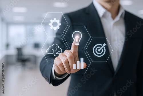 businessman, digital, interface, business, technology, modern, office, strategy, innovation, goal, display, man, touch, screen, virtual, future, analysis, infographic, network, connection, communication, teamwork, solution, success, development, leadership, management, planning, marketing, achievement, target, growth, chart, datum, cloud, gear, light bulb, futuristic