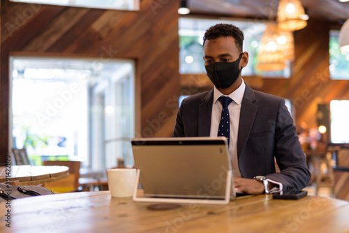 mask, man, african, business, businessman, black, young, people, portrait, suit, manager, professional, job, somali, cafes, hot drink, inside, eatery, shop, store, laptop, computer, work, photogenic, technology, cyberspace, office, men at work, communication, corona, virus, safety, protection, health, using, wearing, face, virtual, chat, video, call, online