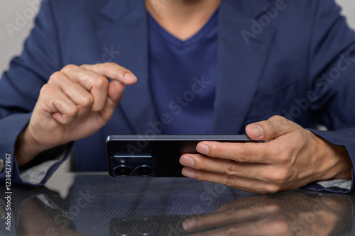 businessman, smartphone, mobile device, technology, communication, office, hand, closeup, professional, digital, screen, interaction, desk, modern, casual attire, suit, network, work, typing, browsing, user, corporate, engagement, online, business, sharpened, lifestyle, male, person, environment, everyday, device, multitask, connectivity, convenience, information, productivity, gesture, action, platform, cyberspace