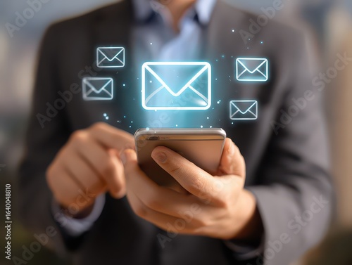 Businessman using smartphone with new email alert. Communication connection messages in global workplaces through email marketing or digital newsletter