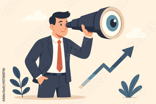 businessman, vision, opportunity, search, career, growth, success, direction, leadership, planning, recruitment, future, strategy, discovery, research, market, trend, telescope, looking, progress, development, business, professional, goal, ambition, target, achievement, analysis, forecast, management, innovation, executive, corporate, upward, arrow, finance, investment, motivation, potential, businessperson, suit, attaching, illustration, flat, concept