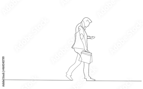 Businessman walking and typing sms message on cell phone. Man walking for marketing, poster, travel agency and magazine. Creative business concept, vector illustration