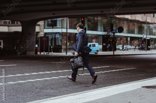business, businessman, businessperson, automobile, carrying, day, one person, entrepreneur, europa, finance, photo, color image, goggles, walking, full-length, horizontal, holding, blazer, communication, crossing, full suit, mature adult, umbrella, briefcase, half face, on the go, rushing, motion, scandinavia, running, city, city life, stockholm, sweden, sidewalk, urban, outdoors, road, bag