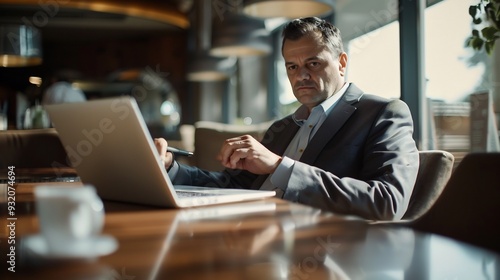 businessman, laptop, cafes, working, table, suit, man, hot drink, business, technology, office, professional, desk, typing, computer, cyberspace, digital, workplace, wireless, connection, communication, concentration, serious, focused, productivity, entrepreneur, corporate, cafes, modern, interior, light, window, sunlight, chair, grey, wood, brown