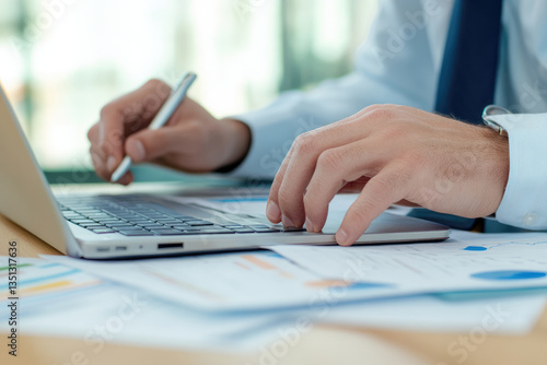 businessman, laptop, typing, office, desk, document, pen, hand, working, professional, business, technology, analysis, datum, report, finance, corporate, productivity, planning, strategy, workplace, meeting, research, management, paper, sharpened, detail, modern, job, career