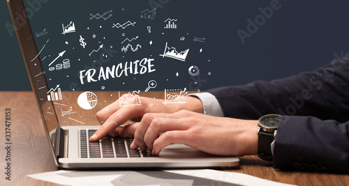 Businessman working on laptop with FRANCHISE inscription, modern business concept
