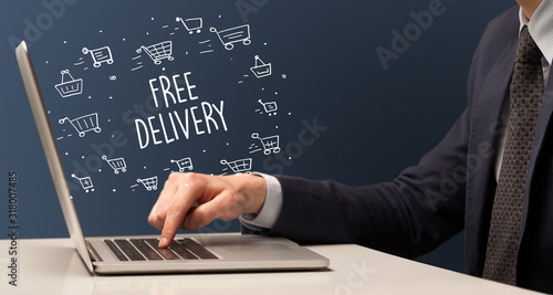 Businessman working on laptop with FREE DELIVERY inscription, online shopping concept