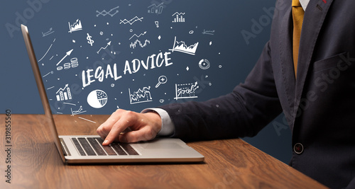 Businessman working on laptop with LEGAL ADVICE inscription, modern business concept