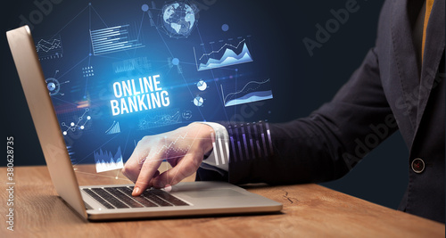 Businessman working on laptop with ONLINE BANKING inscription, new business concept