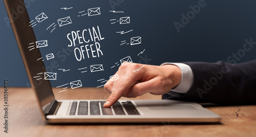 Businessman working on laptop with SPECIAL OFFER inscription, online shopping concept