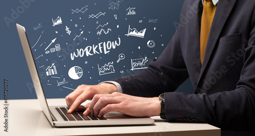 Businessman working on laptop with WORKFLOW inscription, modern business concept