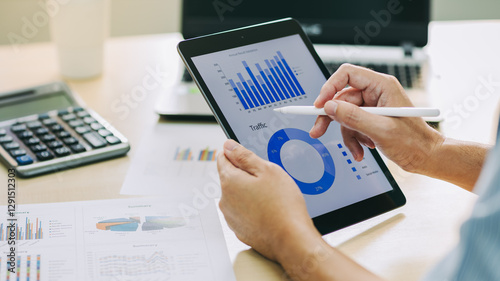Businessman working on project for analyzing company financial report balance statement with dashboard at modern office space. Concept of business economy and marketing result.